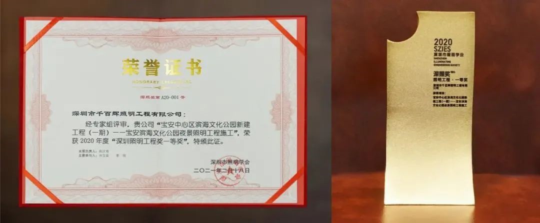 除此之外,在本次頒獎典禮上,千百輝照明還斬獲了其他三個獎項,包括:“寶雞石鼓山區域城市品質提升照明工程”榮獲“深圳照明設計獎優秀獎”、千百輝照明羅曉珊榮獲“深圳照明獎優秀設計師獎”、千百輝照明李剛榮獲“深圳照明獎優秀項目經理獎”。