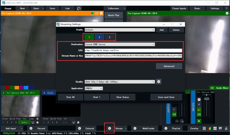 在vMix軟件中添加需要推流的“Program”畫面,點擊軟件界面下方“Stream”左側設置按鈕,在彈出的設置頁面中可以設置3個平臺同時推流直播,將直播平臺所提供的RTMP URL地址和密鑰復制并粘貼到軟件中即可。