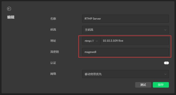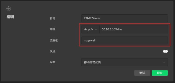 3.在彈出的頁面中填寫RTMP推流地址和流密鑰,點擊保存。