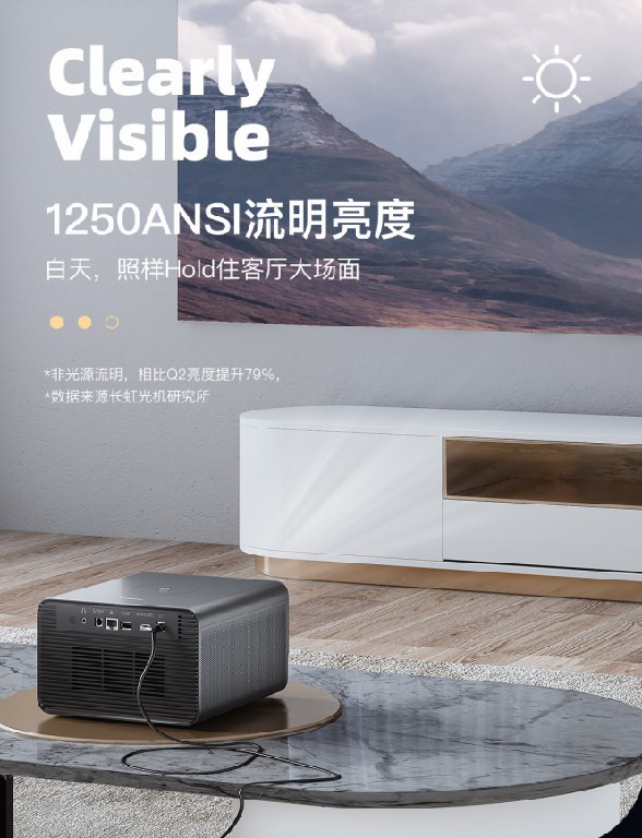 長虹Q3智能投影儀采用歐司朗RGB三色LED光源,擁有11層納米級高光鍍膜的藍寶石AI智慧鏡頭,有效提升光通率和畫面解析度,畫面亮度達到匹配人眼舒適度的1250ANSI流明。同時,長虹Q3還能根據使用場景環境光的不同,自動調節畫面色彩亮度,讓白天的畫面清晰可辨,晚上的畫面亮麗不刺眼。