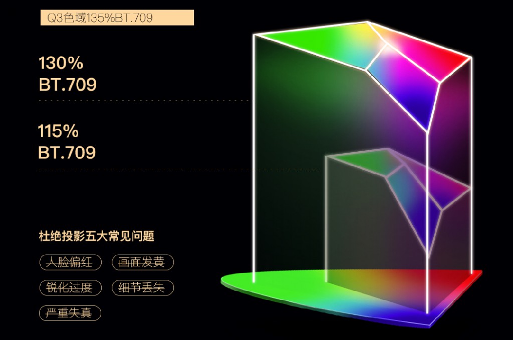 長虹Q3智能投影儀采用長虹自研的AI原色引擎技術,點對點精準還原色彩,色域達到135%BT.709,可以更好地展示色彩層次豐富、明暗不同的花花萬物,不讓眼睛看到偏色、失真、串色、細節丟失的“假”世界,也不讓影視制作團隊想要觀眾看到的每一幀細節畫面被辜負。