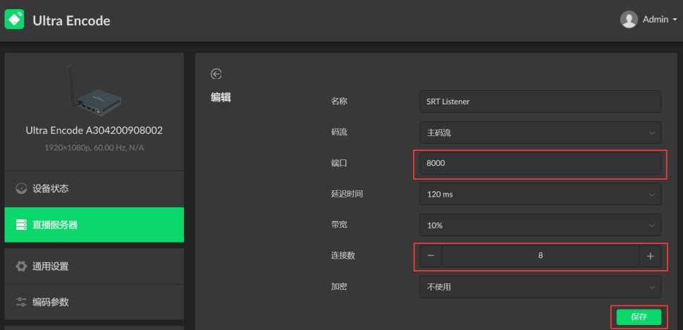 3、在彈出的頁面中填寫端口號(如圖中8000),選擇連接數(SRT Listener最多同時支持 8 個客戶端),點擊“保存”。