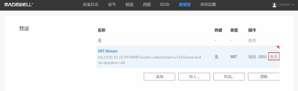 3、此時,會顯示剛才所添加的預設選項,點擊“選擇”,即可解碼來自編碼盒發出的SRT流數據。