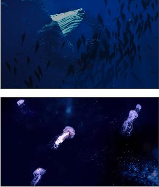 洋流引起魚群穿越,大鯨魚悠閑的在海中覓食,水母飄逸劃過,散發(fā)著光芒,各種生物共同展示著海洋下的日常生活。