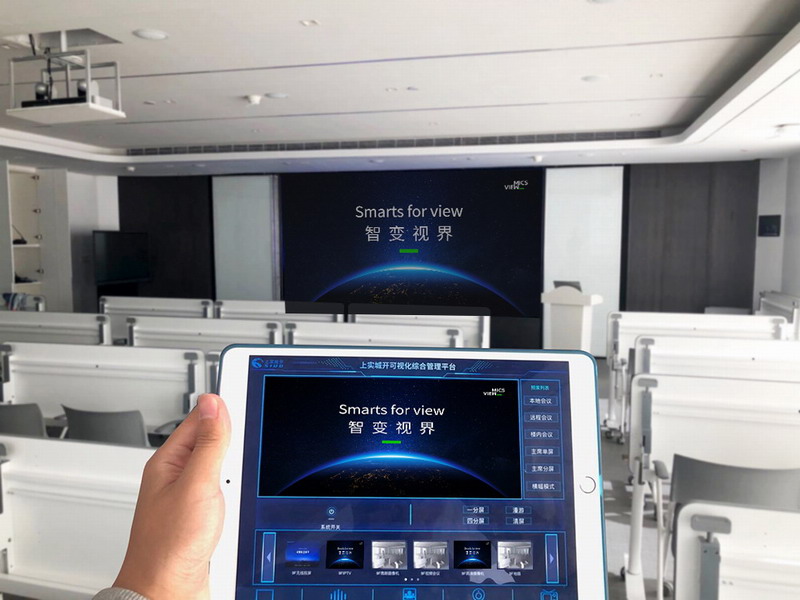 在合肥安糧中心項目中,通過MICS云一體化解決方案,能夠將包括監控視頻、攝像頭,DSP,投影機,LED,燈光等在內的多樣信息匯聚在MICS云中,工作人員可在PAD端對以上音視頻信息及外部設備進行可視化調度,包括上屏、監控視頻預覽、攝像頭角度切換、投影機開關、燈光調整等操作,省時便捷。同時,MICS云平臺還支持一鍵系統開關機,能夠有效避免系統不使用時部分機器空轉導致費電情況的發生。