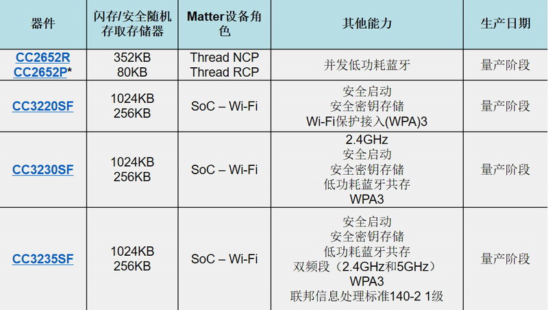 TI 的SimpleLink™ 無線連接產品系列支持適用于Matter 配件的所有基于Thread 的主要系統(tǒng)拓撲。表1列出了SimpleLink™ 產品系列中可通過Thread 和Wi-Fi 支持Matter 的器件。Matter 定義了低功耗藍牙的用途,主要用于設備搜索和預配。