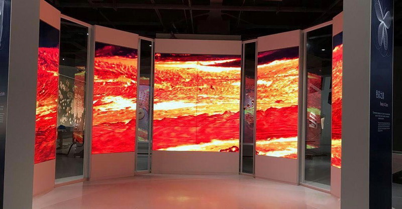 在安吉館自然藝術館內,一架曲形電子屏風引人注目,多媒體屏幕與墻體融為一體,雖然每一面分隔開,卻構成整體的畫面,于分離中實現融合,紛繁中構成一種美妙的秩序,實現科技與藝術的結合。
