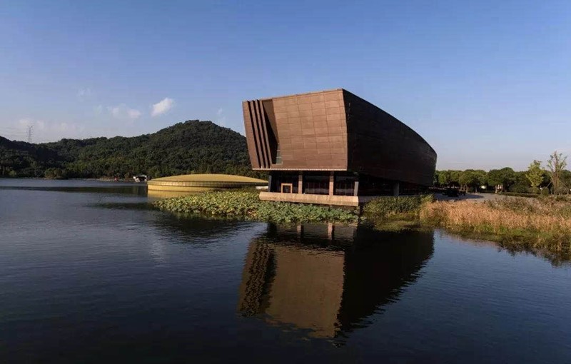 設計成這樣,是因為這里曾出土迄今為止最早的獨木船,為了展現遺址文化特色,便設計成了一葉扁舟,安靜“停泊”在青翠掩映的湖畔。
