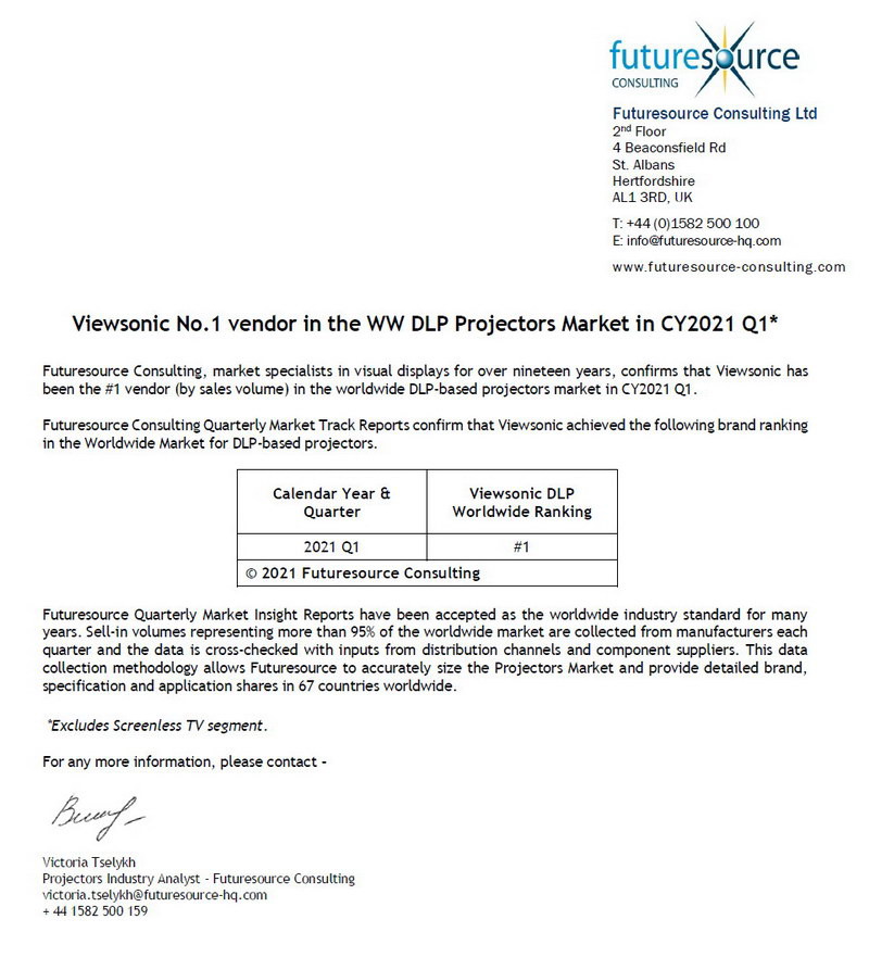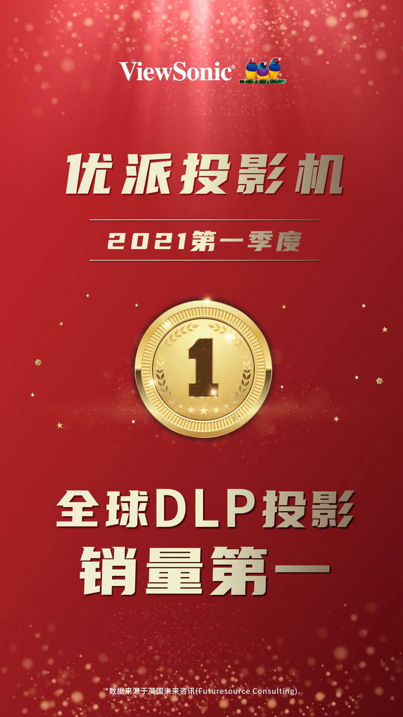 根據未來資源咨詢公司(FutureSource)的季度市場跟蹤報告,ViewSonic優派位于2021年度第一季度全球DLP投影銷量榜單第一。