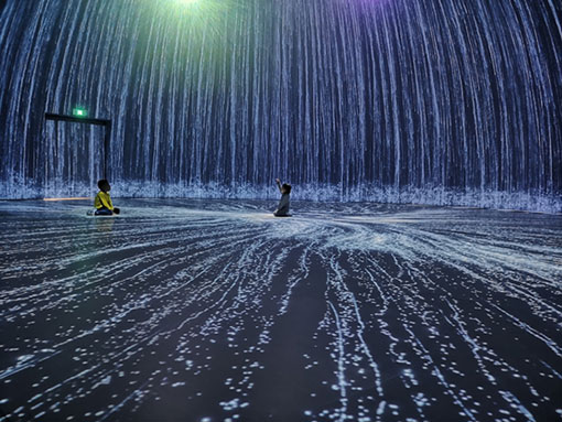 “飛流直下三千尺,疑是銀河落九天”,大詩人李白描述的壯美奇景在這里“真實”再現。宛如蛋殼的球幕展廳里,巨型瀑布傾瀉而下,似銀河從天而降,并在地面迅速匯聚成河,波光粼粼、浩瀚無垠,令觀者贊嘆不已。得以呈現如此雄偉壯觀的瀑布奇景,離不開20臺NEC 4K激光投影機PX1005QL-B+的精彩演繹。巨型碗幕直徑15.4米,高度5.9米,20臺NEC PX1005QL-B+通過隱藏式安裝,采用融合拼接的方式,分別在近百平方米的弧形墻面和圓形地面上進行投射,打造沉浸式互動投影,將觀眾帶到“廣闊無邊”的水世界中,感受瀑布飛流直下的壯麗美景。