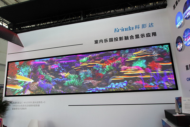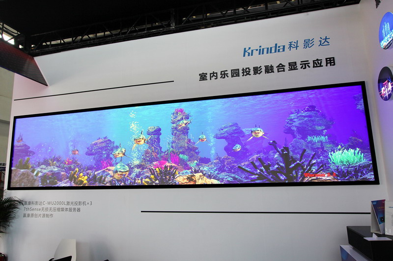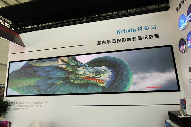 在展位一側的墻面上,是一個由三臺科影達Krinda C-WU2000L投影機投影展示的大型室內巨幕投影秀。