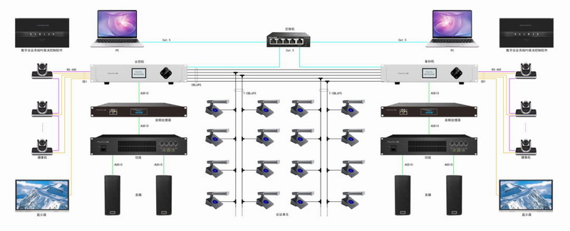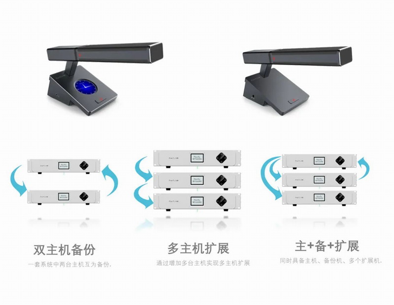 一個系統中兩臺主機接入進來,互為備份,當一個主機出現故障時另一個主機能夠快速的接管會議單元,使得系統正常工作。
