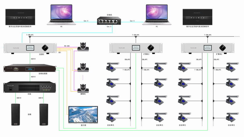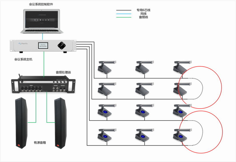 系統示意圖中,每一條線路的會議單元分別接到兩個主機上面,主機之間采用較短的T型線連接。
