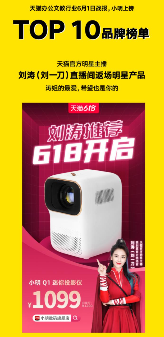 此外,小明 Q1 迷你投影儀還登陸天貓官方明星主播、聚劃算官方優(yōu)選官劉濤“劉一刀”直播間,以出色性能和驚喜好價,成為直播間返場明星產(chǎn)品,并入選天貓辦公文教行業(yè)品牌TOP 10。小明 Q1 迷你投影儀的完美首秀,盡顯千元投影機皇的風采。