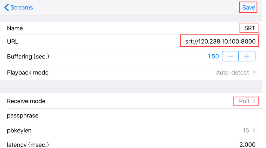 2. 進入設置界面,在“Name”欄填寫SRT流名稱,“URL”欄輸入“srt://120.238.10.100:8000”,并在“Receive mode”欄中選擇 “Pull”, 點擊“Save”。