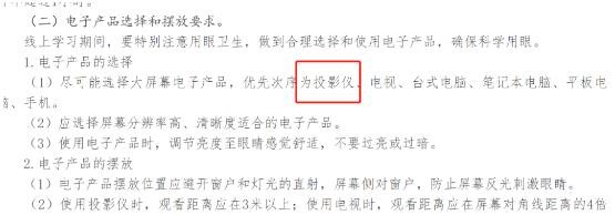 國家衛(wèi)健委發(fā)布的《兒童青少年疫情期間近視預(yù)防指引》也指出:應(yīng)盡可能選擇大屏幕電子產(chǎn)品。針對(duì)如何選擇電子產(chǎn)品以更好地保護(hù)孩子視力的問題,北京同仁醫(yī)院副院長、眼科主任魏文斌也曾表示,選擇視頻工具要堅(jiān)持“寧大勿小”的原則,選擇順序依次為投影、電視、電腦、平板電腦、手機(jī)。因此投影儀成為居家網(wǎng)課學(xué)習(xí)的首選。