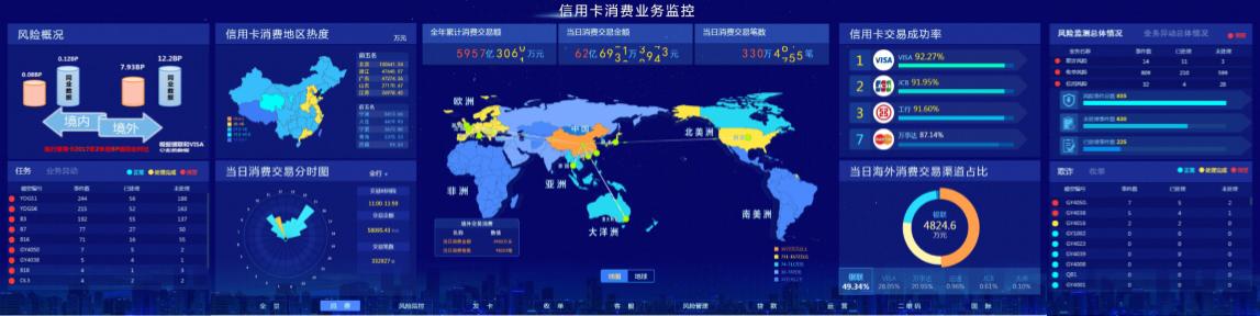 匯聚金融業務交易數據及風險預警數據,通過多維度的數據分析及數據整合,一圖式高分呈現實時的交易監控、風險監控、流程監控數據,實現金融業務數據的實時監控和風險控制,滿足監控中心日常業務監控需要。