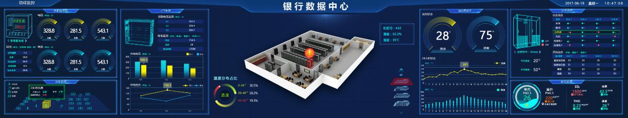 基于數據機房二維平面圖/三維模型,在空間地理位置呈現設備位置及設備狀態信息,并實時顯示設備異常報警信息,同時融合匯聚供配電、UPS、空調、門禁、消防、報警等動環系統監測數據,通過多維全景可視化展示,輔助監控中心工作人員實時掌控數據機房設備狀態和環境狀態,確保數據機房安全運行。