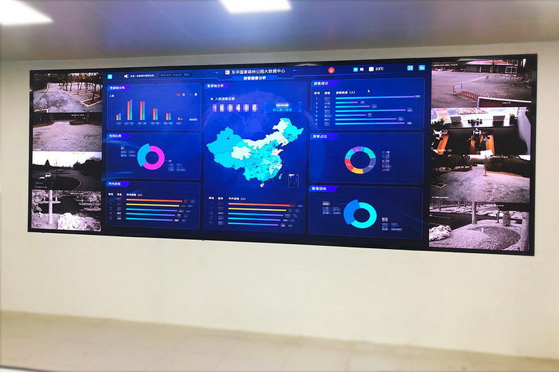 在該項目中,為達到工作人員能夠一屏統覽園區(qū)全貌的效果,大數據信息包括游客成分、停車場數據、總客流量、累積客流、當前在園人數、出入門客流、訂單信息、輿情監(jiān)測等在內的大數據統計都以可視化的形式呈現在東平國家森林公園大數據中心內部的大屏上。
