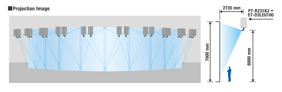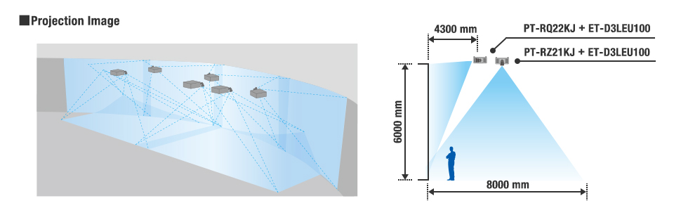 通過垂直安裝的兩臺PT-RZ31KJ(中國型號PT-SRZ31KC)投影機(jī)完成投影。兩臺投影機(jī)負(fù)責(zé)一個區(qū)域的高亮度視頻投射。