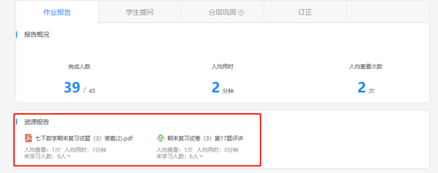老師通過教師空間挑選資源,將習(xí)題推送給學(xué)生進(jìn)行練習(xí),學(xué)生在平板上答完題后,老師可在作業(yè)報(bào)告上查看學(xué)生們的作答情況。通過線上能夠及時(shí)看到學(xué)生的完成情況、答題正確率,讓線上教學(xué)也能夠精準(zhǔn)把握到學(xué)生的復(fù)習(xí)進(jìn)度。