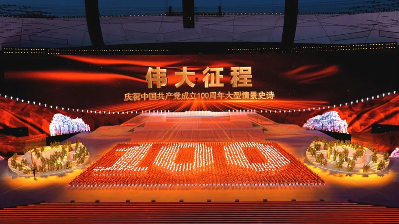 建黨100周年大型情景史詩《偉大征程》遵循編年史表述,總時長120分鐘,共分為“浴火前行”“風雨無阻”“激流勇進”“錦繡前程”四個篇章。綜合運用多種表演藝術與技術手段,結合多媒體和光影藝術,生動展現中國共產黨百年來帶領中國人民進行革命、建設、改革的壯美畫卷,熱情歌頌黨的十八大以來,我們國家取得的歷史性成就、發生的歷史性變革,展示全面建設社會主義現代化國家的光明前景。