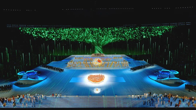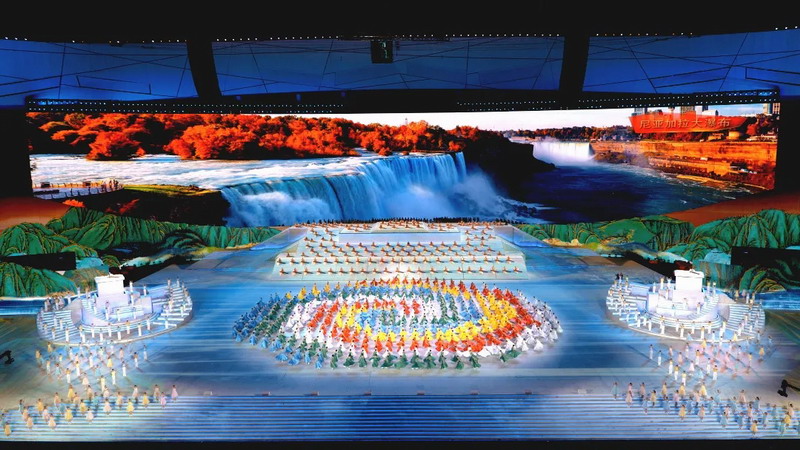 150臺投影機飽滿鋪陳國家體育場的巨大舞臺區域,確保流光溢彩能夠點亮舞臺的每個角落。投影機陣列通過畫面拼接、融合再疊加的方式,撐起整個地面及舞臺影像畫幅,在觀眾眼中呈現出清晰、完整且無縫的視覺效果。