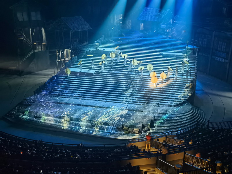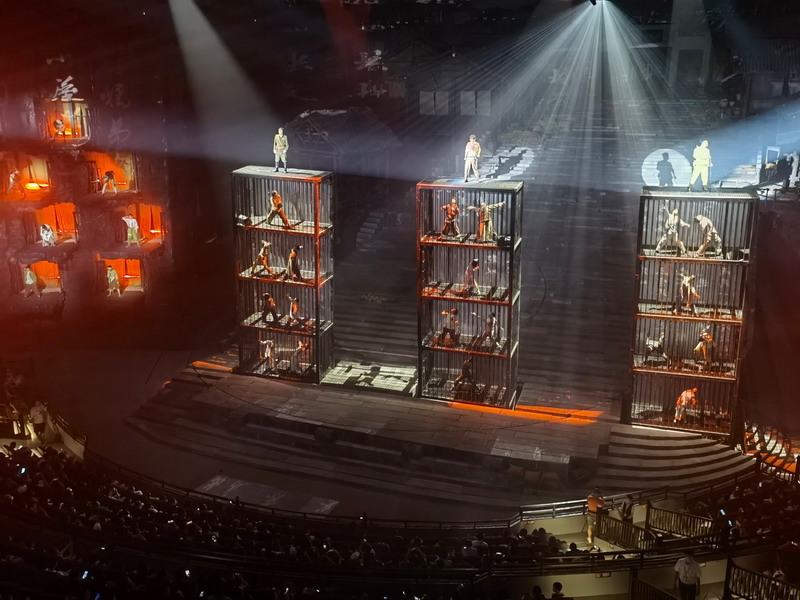 “重慶·1949大劇院”是為《重慶·1949》劇目量身定制的大型非標實景式劇院,總建筑面積達2.5萬平方米,是目前世界上最大的單一室內(nèi)動態(tài)沉浸式表演劇場。其顛覆性創(chuàng)新,向觀眾呈現(xiàn)了前所未見的多維立體沉浸式室內(nèi)動態(tài)舞臺。整個舞臺由5個可360度旋轉(zhuǎn)的圓環(huán)組成,其中1、2、3環(huán)為核心表演及布景區(qū)域,4、5環(huán)既是舞臺也是觀眾席,演藝空間與觀演空間交相穿插,隨著劇情的發(fā)展而不斷變換視角位置,使觀眾與演出完全融為一體,從而營造出身臨其境、如夢如幻的獨特觀演場景體驗。