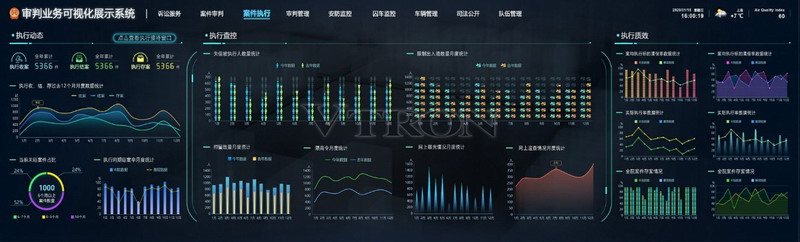 匯聚法院執行案件、遠程執行、執行監督、司法拍賣、執行查控等實時統計數據,通過可視化的方式呈現案件執行的業務全流程,全面完整的體現法院服務審判執行工作的質量及成果。
