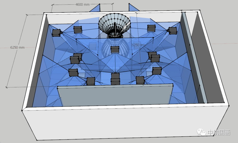 因本次方案相對復雜,需在一個88平空間內搭四面沉浸式效果,中間還需放下一個最大直徑為2.5米、高3.2米的塔結構,涉及投影機臺數達18臺,要確保墻面、地面和塔身均有完整畫面,光路要相互不干涉。為了確保最終效果,首先要通過軟件進行多次模擬搭建,在理論上先滿足要求,而要真正運用到實際中,還需要提前在工廠進行1:1預搭建,預搭建實現效果后,才能在展臺進行正式搭建,確保在展會上為觀眾帶來最完美效果。