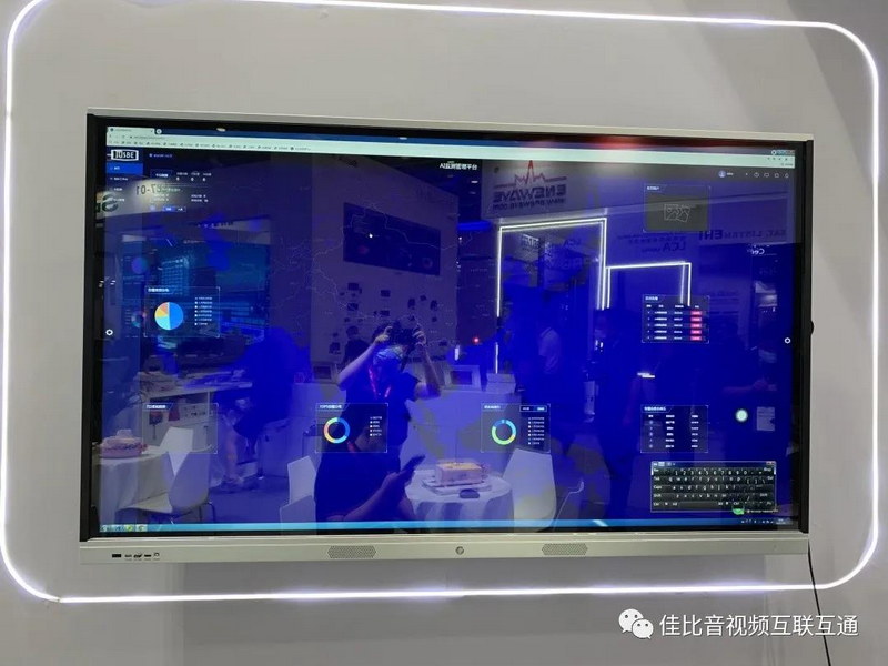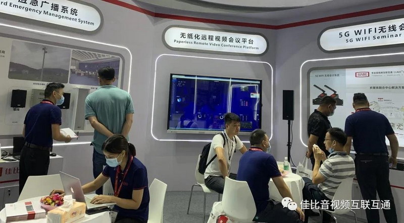 佳比展位現場展示了“無紙化遠程視頻會議平臺、國標應急廣播系統、5G WIFI無線會討系統及校園安全AI管理平臺”四大產品方案。
