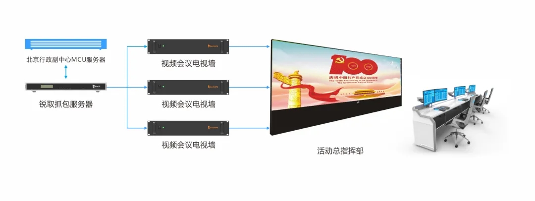 作為本次慶祝大會的活動主會場,天安門廣場現場工作秩序的統籌調度,事關著整場慶祝大會的呈現效果。為保證大會調度指揮工作的有序組織,確保這場盛典的順利進行,天安門管委會采用了多臺銳取視頻會議電視墻來保障大會的調度指揮工作。
