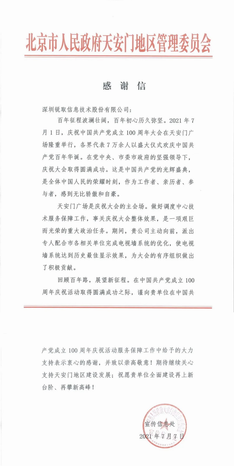 深耕政企全場景視訊服務多年的深圳銳取,多年來深獲行業用戶的肯定與贊譽,在這場百年盛典上,銳取以領先行業的核心技術,完美保障了“慶祝中國共產黨成立100周年大會”的圓滿成功!