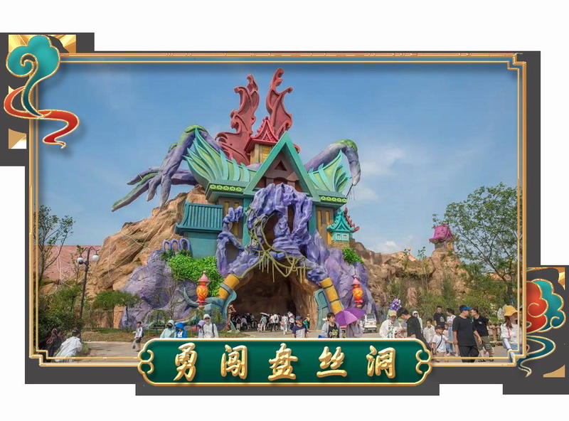 游客乘坐動感車,通過緩緩打開的石門之后,由紗幕投影的洞內景象在半空中浮現,游客仿佛真的進入到記憶中的“盤絲洞”中。