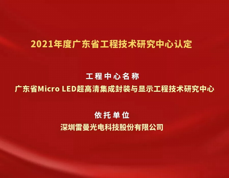 2021年8月,廣東省科學技術廳發布2021年廣東省工程技術研究中心認定名單,我司建設的廣東省Micro LED超高清集成封裝與顯示工程技術研究中心位列其中。