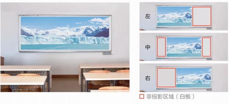 L730U系列支持16:6寬屏模式,最大屏幕尺寸可達452英寸,并且可以通過遙控器調整屏幕位置,這樣可以留出非投影區域,用戶可以在無影像區域進行板書書寫。