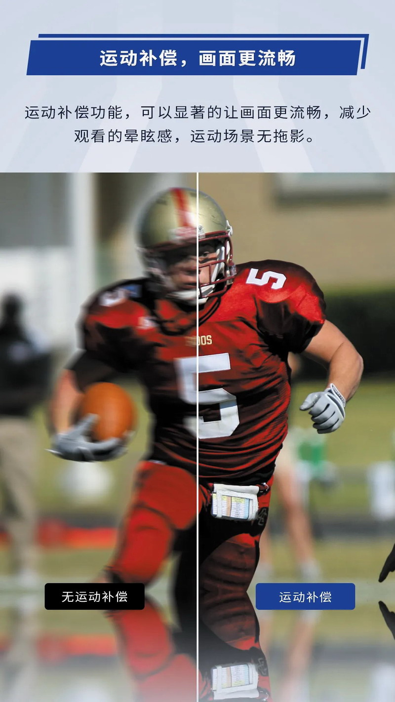 運(yùn)動(dòng)補(bǔ)償,使畫面更流暢,運(yùn)動(dòng)場(chǎng)景無(wú)拖影,減少觀看的暈眩感。