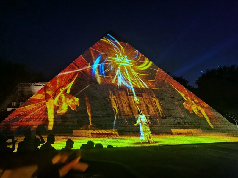 金字塔中的法老靈魂,在天外來客力量的影響下漸漸蘇醒,仿佛被法老意念控制的艷后轉世來到金字塔前..... 2臺16,000流明的PT-SMZ16KCL松下工程投影機在兩座金字塔的觀賞面巧妙打造震撼人心的重生儀式,艷后睜開雙眼、復活于世,高清的畫面科技感與傳統并存,美輪美奐。