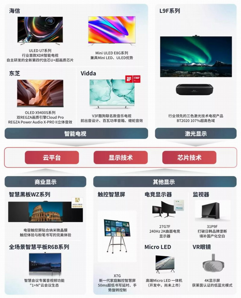 公司以顯示技術為核心競爭力,已完成對產業的結構性調整,形成高度協同的“1+4”多元化業務布局("1",即智慧顯示終端;“4”,即激光顯示、商用顯示、云服務和芯片產業)。
