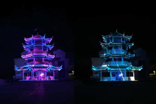 與璀璨的千年古樟樹作別,穿過紅艷的燈籠長廊,便來到了白塔廣場。只見素凈淡雅的四層白塔,在夜色中搖身一變,成了光影的絕佳畫布。3臺21,000流明的PT-SRS20KC松下工程投影機(jī)通過融合處理,將畫面鋪滿了整個(gè)塔體;通過Coolux融合播控系統(tǒng)進(jìn)行播放控制,與燈控臺進(jìn)行對接,確保了現(xiàn)場聲光電同步。溫柔的夜色中,白塔上忽而繁花飄落,忽而光彩搖曳,如同一場夢境。畫鄉(xiāng)白塔建筑融入甌江文化,為游客獻(xiàn)上了一場生動、新穎,充滿活力的光影秀。當(dāng)躍動的流光投射在白塔上,科技與藝術(shù)碰撞出不一樣的火花,我們見證著古堰畫鄉(xiāng)擁抱現(xiàn)代高新科技的容顏,不禁為之感動。