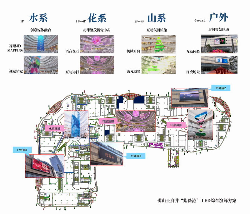 多朝向戶外LED大屏與戶內顯示屏結合交互科技,全場景無死角呈現創意顯示,完美實現“紫薇文化輸出、商家廣告露出、佛山城市文化風貌宣導等各項使用訴求。