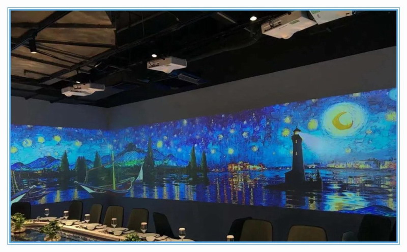 采用了7臺ROLY 專業定制短焦工程機,集成多種幾何校正功能,保障了在有限的空間里發揮其小空間大畫面的優勢,通過精心設計和專業集成打造沉浸式餐飲空間,營造各具特色的用餐環境。