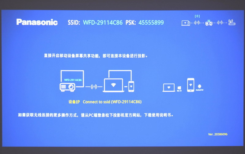 支持Miracast,讓用戶輕松“一鍵投屏”是松下PT-WZ3600的一大亮點,其內(nèi)置5GHz/2.4GHz雙通道熱點,無須任何連接線,也無需其他軟件,電腦(Win10 系統(tǒng)及以上)、安卓系統(tǒng)(9.0 版本及以上)手機或平板可將屏幕鏡像在投影畫面中,步驟簡便,輕松快投,非常易用。
