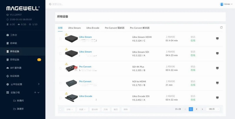 無論是美樂威Ultra Stream系列直播錄制編碼盒、Ultra Encode系列網絡編碼盒或Pro Convert系列編解碼器,都可以注冊到Magewell Cloud上,集成商、管理員和 IT 人員可以通過基于瀏覽器的直觀界面輕松配置和管理任意地點的多臺美樂威IP設備。