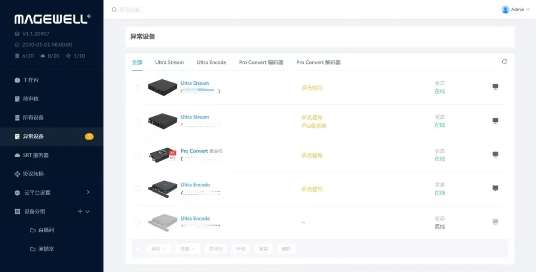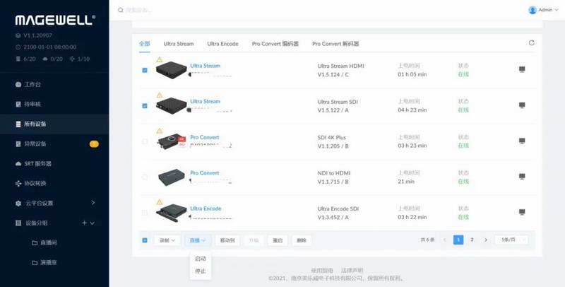 當美樂威IP設備添加到Magewell Cloud后,用戶可以遠程對相同型號的設備進行批量管理和配置,包括批量啟動和停止錄制或直播功能(僅限于Ultra Stream系列編碼盒),固件升級和重啟操作等,簡化工作流程,提高效率。