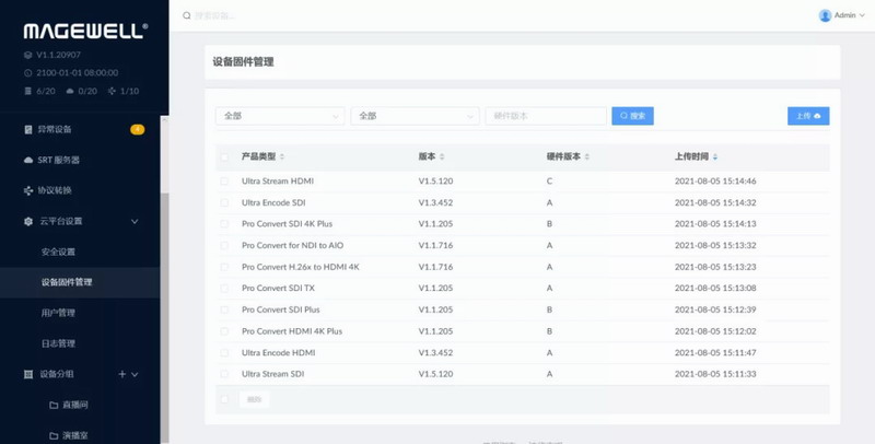 Magwell Cloud支持統一管理設備固件,用戶可以進行固件的批量上傳、升級(限相同型號、相同硬件版本)刪除等操作。
