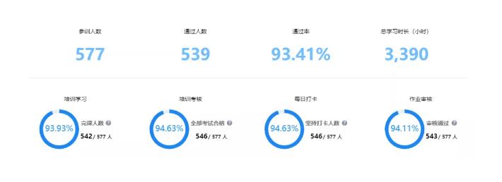 2天的直播課程,7天的線上研修學習,參訓學校涵蓋5所,參訓老師達577人,其中539位老師通過培訓,通過率達到93.41%。本次培訓,干貨滿滿的培訓內容讓教師了解并掌握課件制作的能力,利用信息化工具制作生成式互動式的課件進行互動性教學,讓老師們在將來的教育教學中,能夠再添精彩。