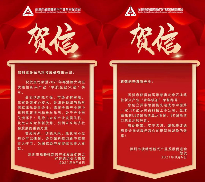 深圳雷曼光電科技股份有限公司(證券簡稱:雷曼光電,證券代碼:300162)上榜2021年粵港澳大灣區戰略性新興產業“領航企業50強”,雷曼光電董事長兼總裁李漫鐵獲評首屆戰略性新興產業“青年領袖”。