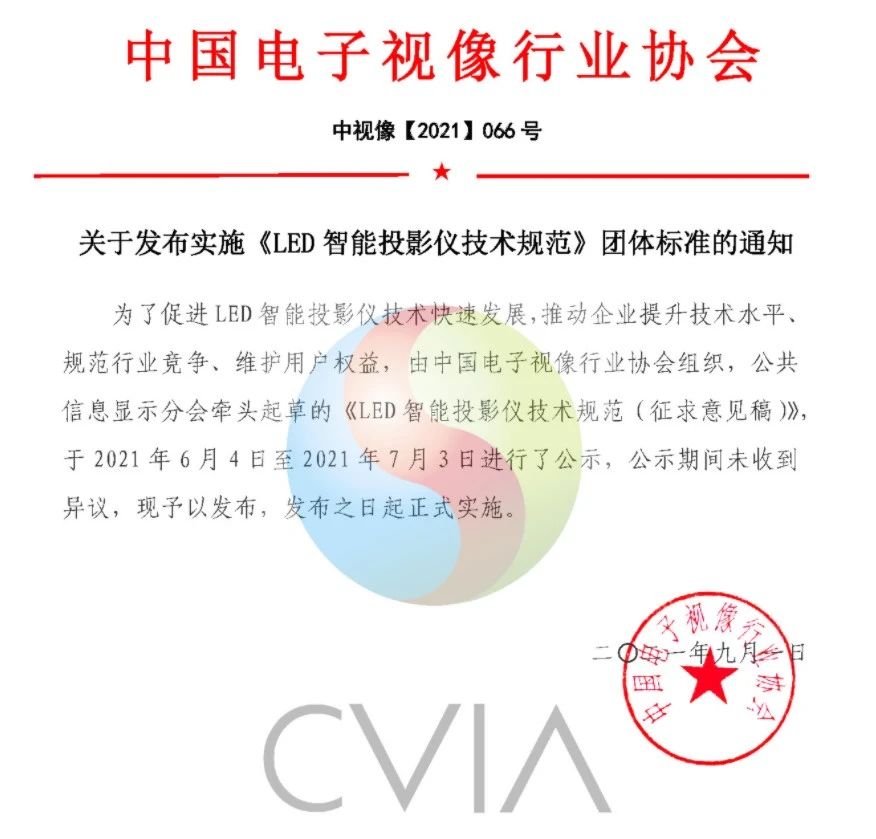 2020年10月13日,中國電子視像行業協會正式對《LED智能投影儀技術規范》進行立項。該標準由中國電子視像行業協會、極米、當貝、峰米、小米聯合發起,渠道商京東深度參與,堅果、大眼橙、騰訊、天貓魔屏等品牌廠商,市調機構洛圖科技以及認證機構中家院共同撰寫。