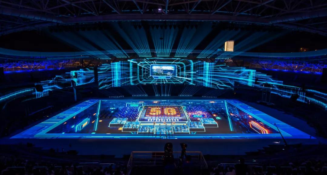 松下系統工程投影機的高品質表現,讓畫面飽滿鋪陳體育場的巨大舞臺區域,通過多臺投影機的畫面拼接、融合,把多幅影像組成一個整體,成功將舞臺變成藝術的幕布,通過大視覺、大張力、制造全新視覺表達方式。